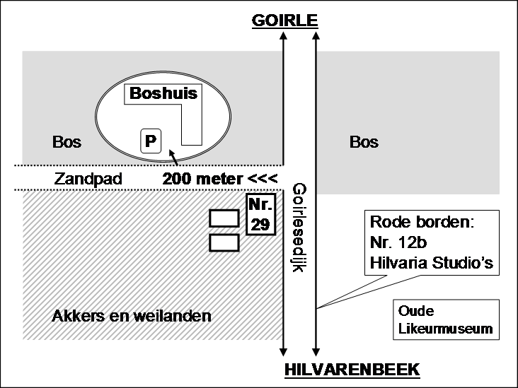 - Aan de Goirlesedijk ± 3 km. buiten Hilvarenbeek, staan rode borden ‘Hilvaria Studio’s nr. 12 b’.